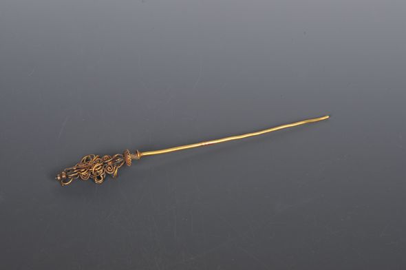 簪整体呈锡杖形,簪头由三部分组成,顶部为一葫芦状物;簪中部六个金丝卷成的如意云纹,两两相对,上挂若干小环,摇晃时会发出响声。