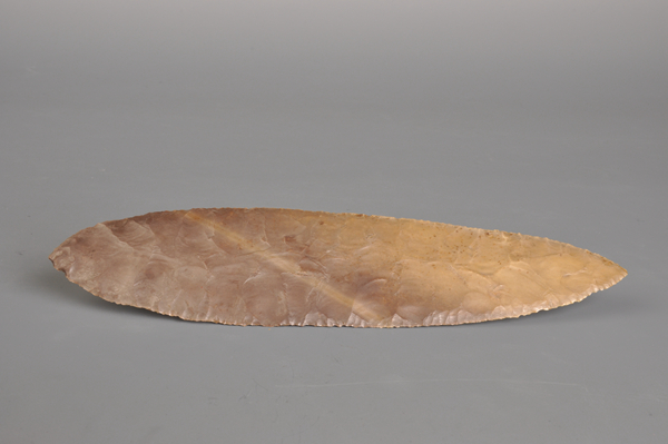 这件桂叶形石器是我省目前发现的细石器中个体最大的一件。此件文物通长25厘米、宽5.8厘米。其形制如一片两头尖的桂叶,故名桂叶形石器。该石器为周身琢,中间厚,两侧薄,形制对称,厚薄均匀,边刃加工制作锋利,是镶嵌在骨刀梗上的石片石器,属刮削器一类。从小南山遗址的整体研究以及这件石器本身的完整和制作精美程度来看,它有可能是这一地区较高级别人物的随葬品,或者是一种礼器。这件石器为我省目前为止发现的细石器中个体最大、最为精美的一件,在细石器功能、工艺的研究上具有重要的参考价值。