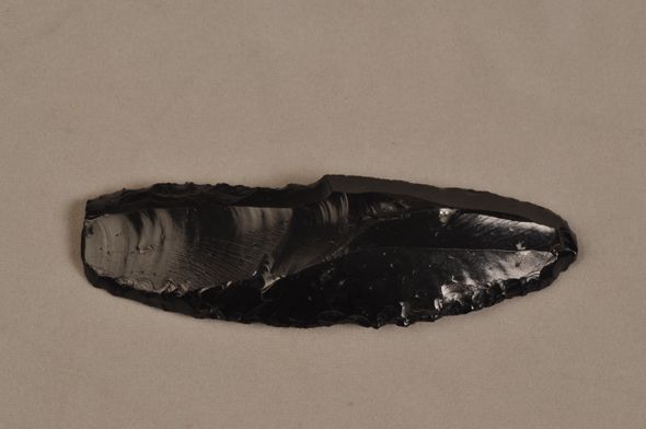 黑曜石长刮削器,莺歌岭遗址出土,长9.5、宽2.9厘米,由黑曜石压制而成。石料大,加工难,为国内罕见。