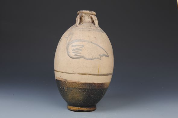 磁州窑系的一种盛酒具,为金代典型器物。瓶腹部绘有两只鹅和一朵云,采用简笔写意的手法,颇似中国的水墨画,虽粗犷豪放,略略几笔,却体现了女真人浓厚的渔猎生活气息。