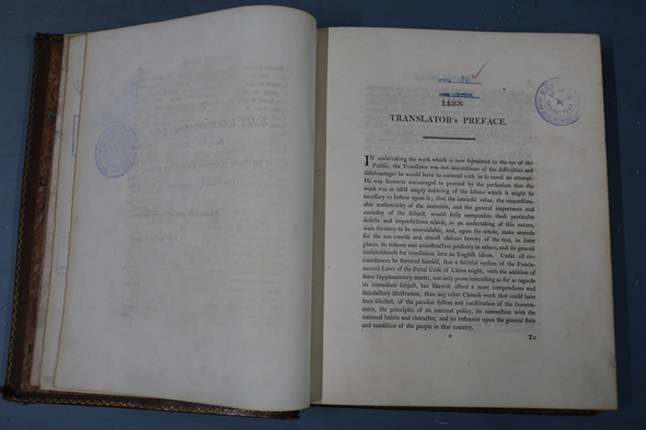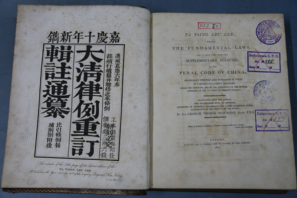 1810年,TA TSING LEU LEE,《大清律例》由小斯当东(Sir George Thomas Staunton ,1781—1859)翻译并在英国出版,这是第一本直接由中文翻译为英文的书籍,体现了英国既关注我国的法律,也关注我国的政治体制和民风民俗,为中英间的法律对比和更加深入地认识中国奠定了基础。小斯当东是英格兰旅行家及东方文化研究者,英国最早的中国通。792—1793年,其父老斯当东作为英国特使马戛尔尼的副使出使中国,小斯当东随行;来华途中,小斯当东跟随使团雇佣的华人翻译学习中文,进步很快,随后在使团谒见乾隆皇帝时用官话和乾隆皇帝直接交谈,一举成名。
