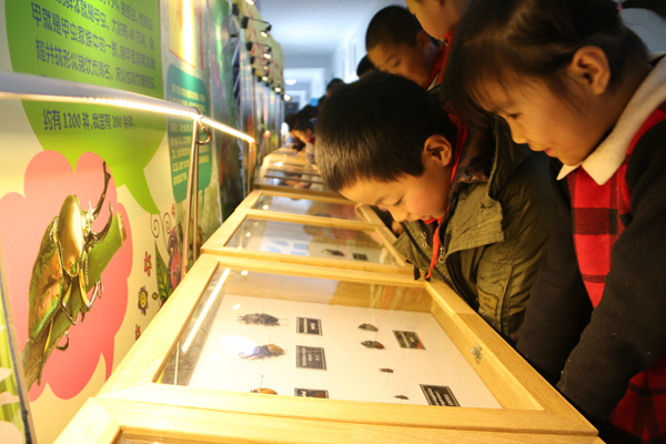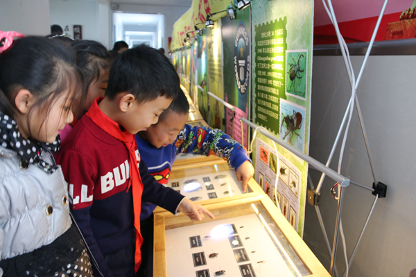 此次展览采用了图板与标本相结合的方式,同学们不仅可以了解展板上所介绍的锹甲知识,还可以见到大小不一、颜色各异的锹甲标本。大家仿佛都身临其境,亲眼见到了这些生活在森林中的“铠甲勇士”。 中心小学五个年级、近400名师生在老师的统一调度安排下,按年级与班级的顺序有序地参观了展览。一年级的同学们年龄比较小,当看到这些活灵活现的标本时,他们表现出了极大的兴趣,一个个都睁大眼睛、急不可待的想去看看这些漂亮的小昆虫,还时不时的发出赞叹的声音,现场气氛十分活跃。当轮到五年级的同学时,他们除了认真聆听讲解,还会积极地与讲解员进行互动,和同学们认真地讨论,从中我们可以真切地感受到他们强烈的求知欲。