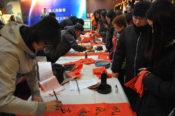 黑龙江省博物馆于活动当天邀请到众多省内知名书法家在黑龙江省博物馆大厅现场为观众书写春联、福字并免费赠送给广大观众。这一活动使观众备有上帝之感:首先,十余位省内知名的书法家任由观众挑选,喜欢谁的字风就选择谁来书写对联;再者,博物馆的工作人员事先准备了若干条对联供观众自由挑选,喜欢哪条就请相中的书法家写哪条。每位书法家前面都排起了长长的队伍,观众都满怀期待与兴奋耐心地等待。临近午休时间,尽管工作人员一再阻拦,热情高涨的观众们还是使书法家们的午餐时间足足推迟了近一个小时。而观众朋友们手捧对联和福字时脸上洋溢的“要过年了啦”的喜悦和开怀,让书法家们忘记了被观众包围、不停歇地挥墨的辛劳与被迫延迟午休的饥饿。