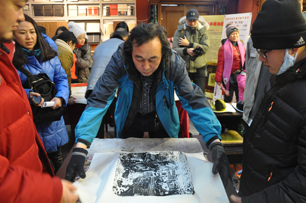 黑龙江省著名冰雪艺术专家及冰版画创始人朱晓东,现场演示了冰版画的制作过程。他酣畅的绘画功底与娴熟的冰版雕刻技术,顷刻间就完成了一幅冰版画冰版模板的刻画,再加上上墨涂色、拓画,很快一幅幅栩栩如生的冰版画便呈现在观众眼前。而且随着时间的推移、冰的渐渐融化,每幅画之间都会有些许的不同,画风逐渐呈现水墨般的韵味,着实令人感叹冰版画的神奇!朱晓东老师的现场作画,不但让大家亲身感受了冰版画制作的全部过程,更展示了独具龙江地域特色的冰雪文化的独特魅力!