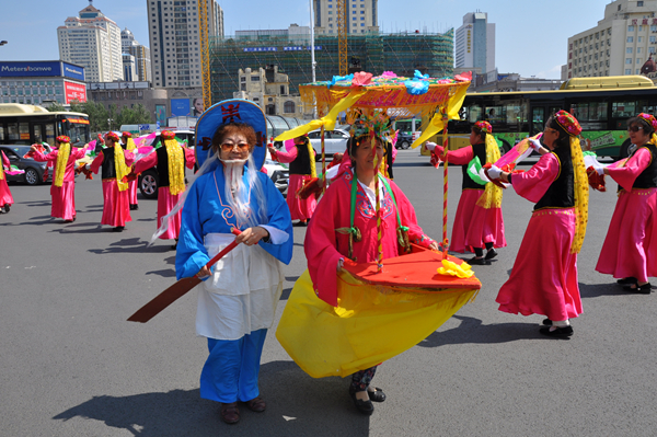 赛龙舟是端午节的习俗,也是端午节最重要的民俗活动之一,在中国的南方普遍存在,在北方靠近河湖的城市也有赛龙舟习俗,而大部分是划旱龙舟舞龙船的形式。龙博民俗活动的展示就采用了传统的旱船秧歌的表演,充分展现了红红火火的东北大秧歌。此次的旱船秧歌表演由来自普通社区的居民历时一个多月编排、演练而成,表演场景幽默诙谐,又不乏鲜活性和亮点,成为了本次民俗展示活动中一道最亮丽的风景线。