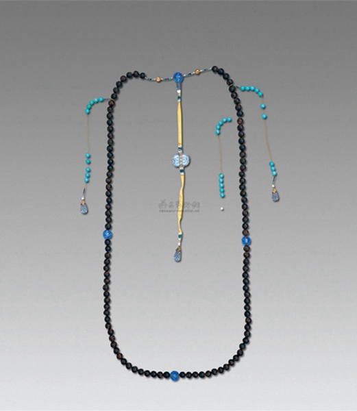 展览中展出的清木质玉石朝珠是黑龙江省博物馆馆藏精粹之一—,由108颗木质珠穿成,珠串中穿有翠珠4个,上端翠珠与小翠葫芦相连成佛头塔。朝珠上附有3串玻璃珠组成的记捻,每串记捻分别有10颗珠及1个坠角。