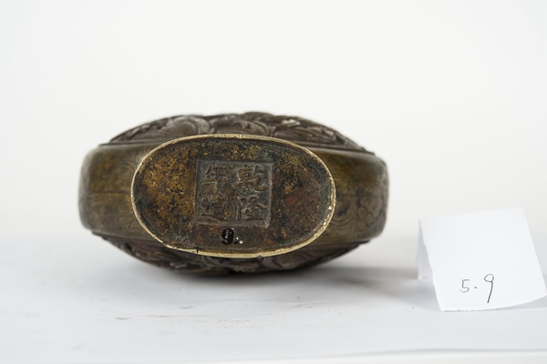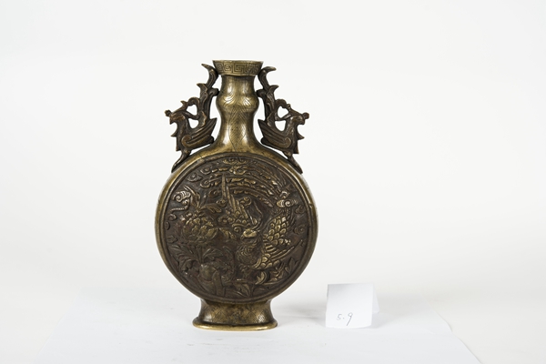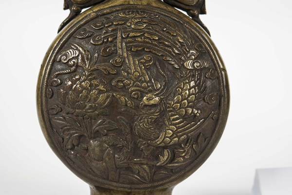 名称:清半浮雕丹凤纹凤耳铜扁瓶