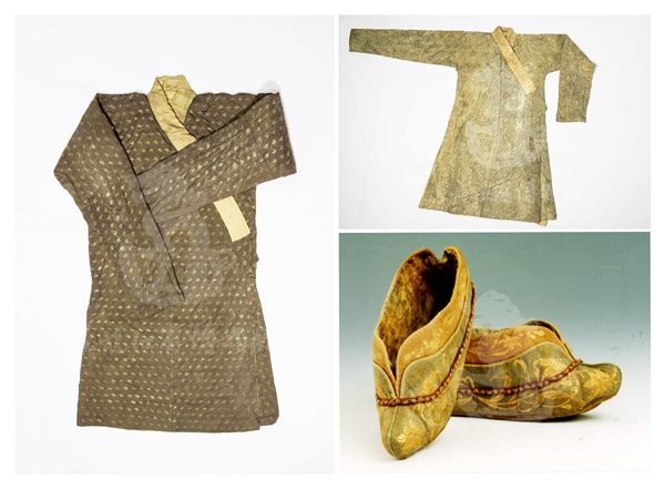 完颜晏在金代地位尊贵,从他墓葬中出土的30多件用料精美、做工考究的最高阶层贵族丝织服饰和冠带便可看出。在男性墓主人身上的棕褐团花绣大口裤,采用素绢面料缝制而成,在腰背开口处有三对系带,裤脚上扣有脚蹬套带,被专家称为“八百年前的脚蹬裤”,其样式非常适合女真族骑马活动。紫地云鹤纹织金锦棉袍着于女性墓主人身体的最外层,绛紫色的衬里质地为绢,里面絮着丝棉。棉袍使用了织金面料,“双鹤飞翔”图案配以灵芝形的云朵,营造出仙境般的氛围。