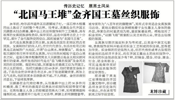 28年前,哈尔滨市道外区巨源镇城子村,一座石椁木棺墓的出土轰动了当时整个考古界。经考证,该墓是金代齐国王完颜晏夫妇合葬墓,墓中出土的丝织服饰制作工艺精湛,具有浓厚的女真民族游牧色彩,保存完好,这在中国考古史上十分罕见,填补了金代服饰史的空白,因而被誉为“北国马王堆”。