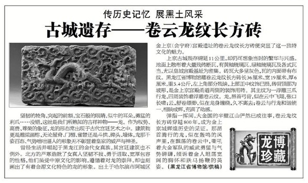 曾经生活并崛起于黑龙江的金代女真族,其宫廷建筑也不例外。北方的严寒造就了女真人坚韧不拔、勇于进取、宽厚包容的性格,他们虽受中原文化的影响,遵循着对龙的崇拜,却也刻画出了有着金源文化特色的龙的形象。出土于哈尔滨市阿城区金上京(会宁府)宫殿遗址的卷云龙纹长方砖便突显了这一独特文化的魅力。