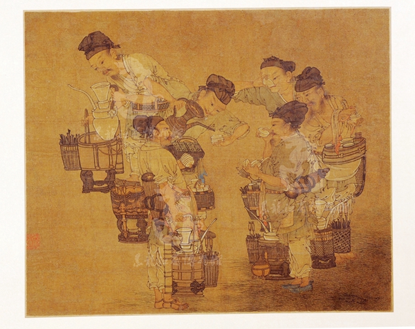《斗浆图》纵40.6厘米,横33.8厘米,绢本,设色,曾为清初书画收藏家张则之的藏品。画作以花青、赭石、藤黄为主要色彩,通过明暗烘托以增强立体感和空间感。画中六位斗茶者皆头扎皂色裹巾,上穿齐膝白色或青色襦袄衫,下着白裤,其中三人脚穿草鞋,一人脚穿蓝色布鞋,还有一老者赤脚,再现了宋代“诸行百户,衣装各有本色,不敢越外”中的小街商服饰。这些人神态各异、栩栩如生:有的提着茶瓶倒茶,有的边提茶瓶边夹炭理火,有的端茶于嘴边细细品茶,有的手提茶盏似乎在交流着什么……