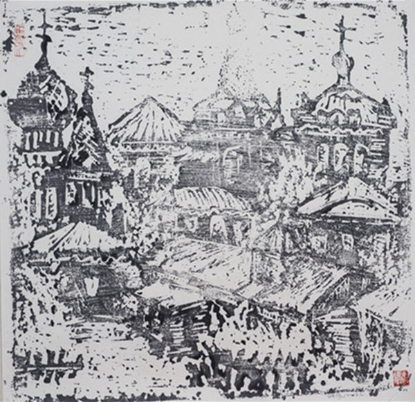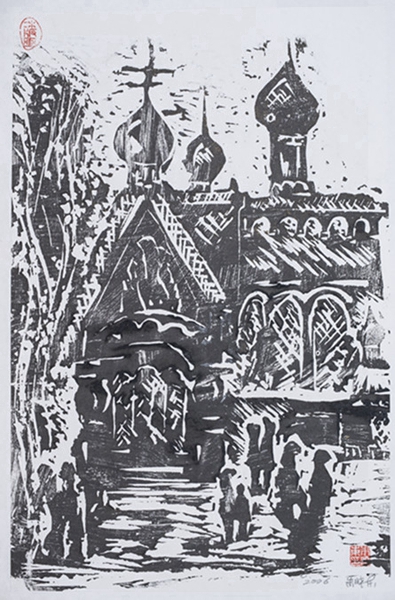冰版画与其它版画有所不同,是在一块厚度不等的冰板上用刻刀进行创作,边刻边印。每一张版画随着冰块的融化印出来的效果都有所不同,因此,每张冰版画都是“绝版”。哈尔滨独具特色的老房子,充满俄罗斯风情的教堂,雪原中的小屋,这些充满了北方韵味的场景是朱晓东创作冰版画的主要内容。其作品着重运用线条表现形象姿态和内部节奏,作品动中有静,静中有动,深沉厚重,线条的流动使画面带有舞蹈的意味。