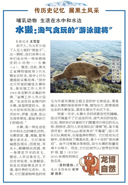目前,黑龙江省博物馆藏水獭生态标本共3只,其中两只为建国前采集而得,而图中这只可爱的雌性水獭标本为黑龙江省博物馆工作人员于1956年在野外采集时所得。虽然水獭分布范围极广,亚洲、欧洲、非洲都可见到,但由于猎捕等原因,数量已很稀少,现其已列入《世界自然保护联盟》(IUCN)2015年濒危物种红色名录。