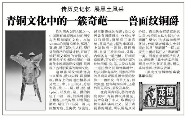 作为四大文明古国之一,中国拥有着源远流长的历史与光辉璀璨的文化。在这5000年的漫漫长河中,那远在夏、商、周王朝的先人们,早已凭借自己的聪慧才智,开辟了灿烂而又辉煌的青铜文明。而黑龙江省博物馆里的一尊商代中晚期兽面纹铜爵,则展现了古时那繁盛的青铜文化。