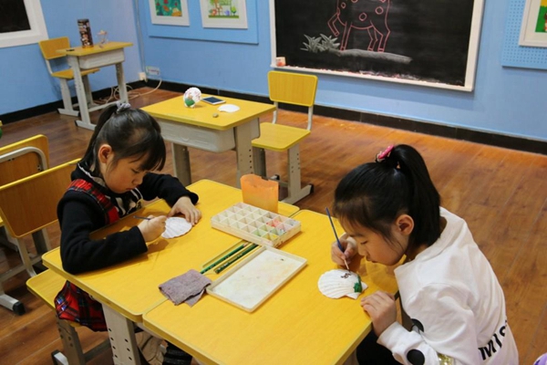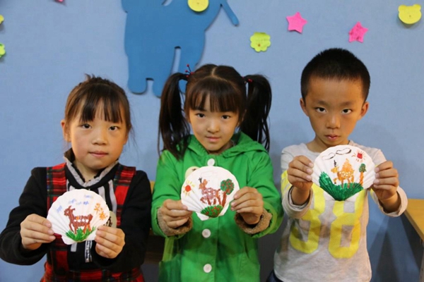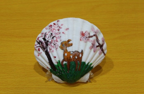 回到教室,同学们都兴高采烈地拿起画笔进行作画,贝壳在孩子们的手里被赋予了新的生命。被五颜六色的广告颜料勾勒出的一只只小鹿俏皮可爱,它们跳跃在绿色的草地上,有大树、有阳光多么的惬意。