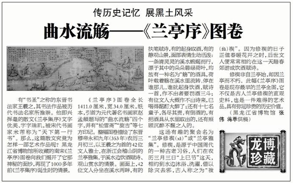 有“书圣”之称的东晋书法家王羲之,其书法作品被历代书法名家所推崇。他即兴挥毫的散文《兰亭集序》文字优美、字字珠玑,被宋代书画家米芾称为“天下第一行书”。那么,这篇散文究竟为怎样一部艺术作品呢?黑龙江省博物馆所收藏的南宋《兰亭序》图卷向我们揭开了它那神秘的面纱,再现了1000多年前《兰亭集序》诞生时的情景。
