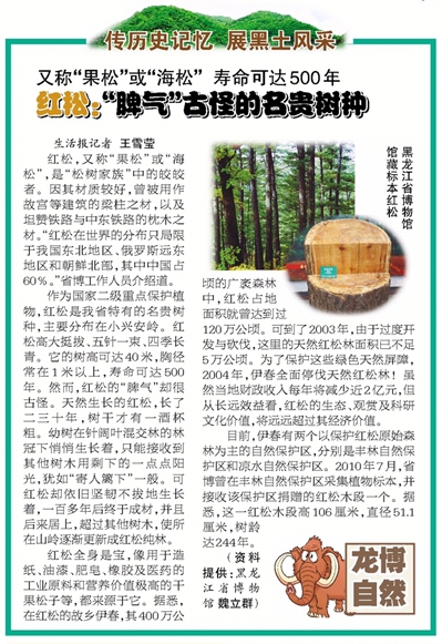 提起松树,人们往往会想起坚贞不屈的英雄,想起它那“咬住青山不放松”的顽强精神和“岁寒然后知松柏之后凋”的高尚品格。红松,是众多松树中的佼佼者,因为它材质好,曾被用作北京故宫等著名建筑的梁柱用材,也被用作修坦赞铁路和中东铁路的枕木用材,又因为它主要分布在小兴安岭,成为黑龙江省特有的名贵树种。