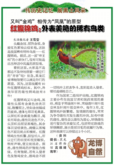说到此,大家一定迫不及待地想要一睹红腹锦鸡的“芳容”了吧?黑龙江省博物馆可以满足大家的愿望,这里收藏有红腹锦鸡标本10件,其中,外表华丽的雄性锦鸡就有8件呢!