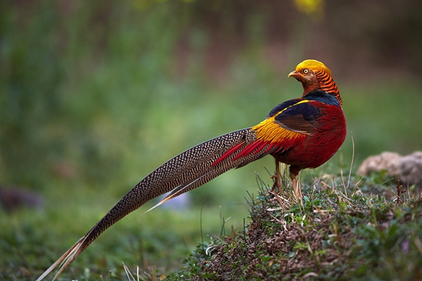 其实,红腹锦鸡早已红遍我国大江南北,因为它很有可能是远古神话中凤凰的原型。红腹锦鸡又叫金鸡,其雄性锦鸡头部具金黄色丝状羽冠,散覆颈上,恰如金丝编成的披肩,通体七彩羽毛兼具,以深红和金黄最为醒目,尾长而弯曲;雌性则逊色不少,头顶和后颈黑褐色,其余体羽棕黄色,满缀以黑褐色不规则斑点和横斑。