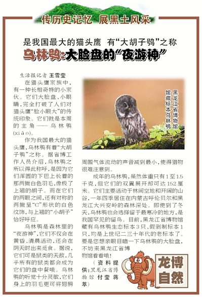 作为我国最大的猫头鹰,成年的乌林鸮体重虽只有1至1.5千克,但双翼展开却可达152厘米,身高最高有84厘米。它们主要活动于林间空地和开阔山谷,一年四季居住在内蒙古呼伦贝尔和黑龙江大兴安岭的森林深处,即使到了冬天,也会选择留于这最寒冷的地方,是我国罕见的留鸟。目前,黑龙江省博物馆藏有乌林鸮生态标本3只、假剥制标本1只,均是上世纪二三十年代的老标本了。要是你想亲眼目睹一下乌林鸮的“大脸”,不妨来黑龙江省博物馆参观吧!