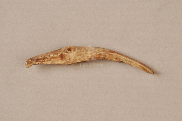 这件骨雕鹰首现藏于黑龙江省博物馆,其整体呈弧状,长7.30cm、宽2.50cm。鹰首形象,十分逼真,呈弯钩状的一端为鹰嘴,延伸至鹰眼下方,上有数道划线,为嘴上的纹路,鹰眼大而圆,怒目而睁。想必远古的艺术家们,定是在生产实践中对鹰的生态习性做了深入细致的观察,才能以极其洗练的手法,简洁、生动地刻划出那翱翔在碧波万顷的兴凯湖上空、正用犀利的眼神寻觅猎取对象的猎鹰。