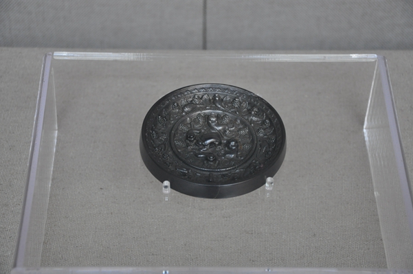 此次展出的珍禽瑞兽葡萄镜出土于黑龙江省牡丹江市温春乡敖东遗址。圆形,铜质,兽纽。直径10厘米,镜缘厚1.7厘米,年代为唐渤海(公元698年—926年)。镜缘凸起并饰有纹饰,镜背主题纹饰系浮雕而成,分为内外两区:内区有四只瑞兽同向排列,追逐嬉戏,瑞兽之间为蔓枝葡萄的叶子和果实,另有一瑞兽为工匠对镜纽的巧妙造型,毫无违和感的融进纹饰之中;外区以葡萄蔓枝叶实为主,还间以珍禽环绕。
