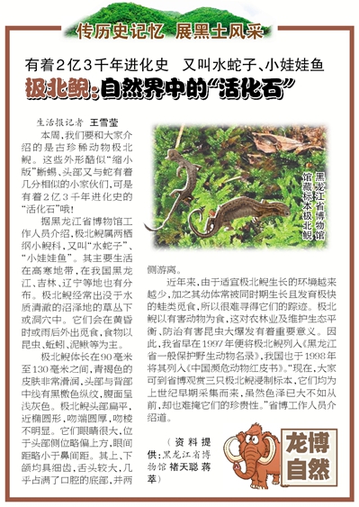 近年来,由于适宜极北鲵生长的环境越来越少,加之其幼体常被同时期生长却发育得更快的蛙类觅食,导致很难寻得它们的踪迹。可是,极北鲵主要吃食有害动物,这对农、林业及维护生态平衡与防治有害昆虫大爆发有着重要意义。因此,黑龙江省早在1997年便将极北鲵列入《黑龙江省一般保护野生动物名录》,我国也于1998年将其列入《中国濒危动物红皮书》。现在,观众在黑龙江省博物馆里所能见到的3只极北鲵浸制标本,均为上世纪早期采集而来,虽然色泽已大不如从前,却也难掩它们的珍贵性。