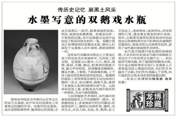 曾统治中国北方半壁河山百年余久的金代女真族,在中华文明发展史上有着举足轻重的作用。印象中的女真族,或许是那铁骨铮铮、魁梧强壮的民族,亦或许是那以一敌百、骁勇善战的民族。然而,铁腕也难掩柔情。即便是这样一个坚韧的民族,在中国瓷器文化史中也绘就了极具民族色彩的一笔。现藏于黑龙江省博物馆的双鹅戏水瓶,便向人们展现了女真人质朴亲和、清新淡婉的一面。