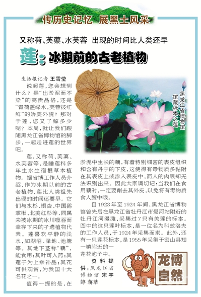 自1923年至1924年间,黑龙江省博物馆曾先后在黑龙江省牡丹江市爱河站附近的牡丹江河漫滩采集过7只有关莲的标本,而图中的这只莲叶标本,是一位名为科兹洛夫的工作人员,于1924年采集而来。此外,还有一只莲花标本是1955年采集于密山县知一镇附近的一莲花泡子中。