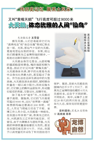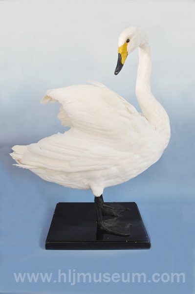 大天鹅是一种候鸟,在我国分布非常广阔,像黑龙江的扎龙、兴凯湖及三江平原均能见到。曾经,由于大肆捕杀与湿地开垦,大天鹅的种群数量面临着巨大危机,甚至在我国仅能见到474只。对此,我国予以高度重视并采取有效措施进行保护。目前,据统计,大天鹅在我国境内已不少于1万只了。黑龙江省博物馆所收藏的大天鹅标本共4只,采自于不同时期、不同地点。其中,采集于上世纪20年代的两只标本,因其年代久远、保存完好而更显珍贵。