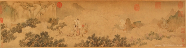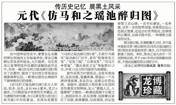 在中国神话传说中,掌管女仙名籍的神仙领袖西王母每逢寿辰,便会召集群仙至其居所瑶池,大开筵席。而在黑龙江省博物馆所收藏的诸幅绘画作品中,恰有一幅《仿马和之瑶池醉归图》契合了此题材,描绘了当时西王母瑶池仙境宴请群仙后,一醉酒仙姬在仙婢陪伴下骑神鹿而归的情景。