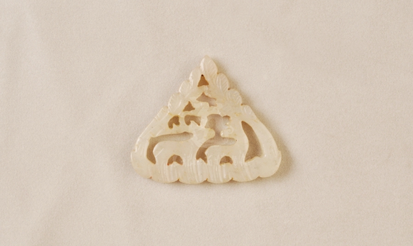 提起秋山玉,不可不提黑龙江省博物馆所珍藏的一件金代雕刻艺术精品——双鹿纹玉佩。此玉佩为黑龙江省考古队于1974年在绥滨县奥里米古城北面约100米处的金代墓葬发掘出土,由和田白玉精雕而成,玉质透明温润,泛光泽,底边长4.0厘米、高3.4厘米、厚0.4厘米。玉佩造型精巧别致,构图清新典雅:其底部两端,分别有一棵根干粗壮的树木相向生长,树梢上那繁茂的枝叶随风摇曳,自然和谐地相互交织而使玉佩整体略呈三角形;树下一只体态健美、昂首挺立的雄鹿朝向前方,其鹿角与树干相连,一只体型略小的雌鹿正回首凝视雄鹿,其耳部则与另一侧树叶相接;而两鹿上方,一只大雁盘旋低回、振翅翱翔,似欲南归。