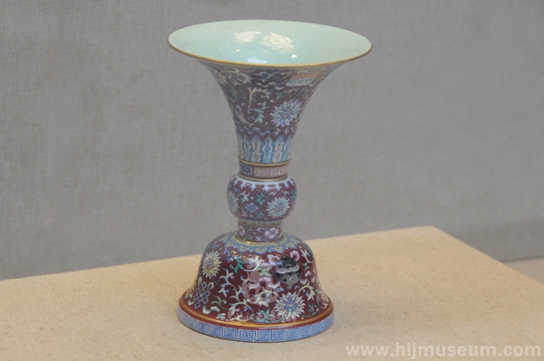 花觚为喇叭状侈口,细长颈,圆鼓腹,束腰,钟形胫,圈足。其器内与底部皆施松石绿釉,外表以胭脂紫为地。主体纹饰八吉祥纹分绘在颈部和胫部。花觚口沿描金,下接如意云头纹,颈部主体图案是番莲托八吉祥纹,其下为蕉叶纹。长颈下端和腹部相接处有描金弦纹两道,其中间部分是半周一描金长方形框,内书“大清乾隆年制”六字单行篆书款和以蓝、白双彩套绘的半周回纹;鼓腹处主体图案绘番莲纹,辅以变形如意云头纹等纹饰;腹部和胫部相接处也有描金弦纹两道,绘花朵图案;胫部从上至下分别为如意云头纹、番莲托八吉祥纹、描金弦纹;圈足处以蓝彩绘一周回纹。