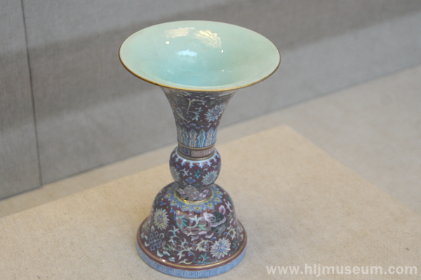 花觚源自于作为酒器的觚,觚始见于新石器时代陶器,商、周时期流行青铜觚。宋代开始烧制仿青铜觚的瓷质觚,其后流行于元、明、清三代,用于插花、陈设和供器之用,所以被称为“花觚”。此花觚主体纹饰乃八吉祥纹,据此推断,它应是五供之一。五供由香炉一、花觚二、烛台二组成。清代有瓷、玉、珐琅、铜、锡等材质的花觚。