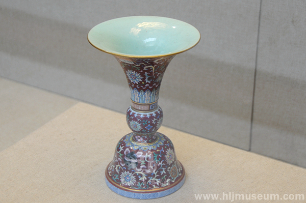 花觚为喇叭状侈口,细长颈,圆鼓腹,束腰,钟形胫,圈足。其器内与底部皆施松石绿釉,外表以胭脂紫为地。主体纹饰八吉祥纹分绘在颈部和胫部,花觚口沿描金,下接如意云头纹;颈部主体图案是番莲托八吉祥纹,其下为蕉叶纹;长颈下端和腹部相接处有描金弦纹两道,其中间部分是半周一描金长方形框,内书“大清乾隆年制”六字单行篆书款和以蓝、白双彩套绘的半周回纹;鼓腹处主体图案绘番莲纹,辅以变形如意云头纹等纹饰;腹部和胫部相接处也有描金弦纹两道,绘花朵图案;胫部从上至下分别为如意云头纹、番莲托八吉祥纹、描金弦纹;圈足处以蓝彩绘一周回纹。