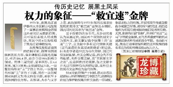 1973年,在黑龙江省伊春市大丰区横山屯发现了一面裹在丝绸和金箔里且外形完好无损的符牌,只可惜后来被人切成数块,而其中的4块现收藏于黑龙江省博物馆内。