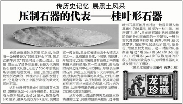 这件桂叶形石器在中国尚属首次发现,因形制犹如一片桂叶而得名。其以燧石为原料制成,全长25.0厘米,最宽处有5.92厘米,最厚处则仅为0.9厘米,现属国家一级文物、黑龙江省博物馆十大镇馆之宝之一。此石器周身琢,中间厚,两侧薄,形制对称,双面均采用具有极高水平的压制技术进行修理:第一次压制时,由毛胚的两侧边缘向中心用力挤压,形成长而薄的石片,并在正反两面留下大而平的石片疤,使其成为非常薄的半成品;之后,沿着周边两面做第二次压制修理,使其周边留有细而平且相当均匀的脱落小石片疤的痕迹,从而使石器的形状变得更加规整,刃口和尖部更加锋利。