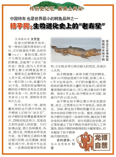 在庞大的“鳄鱼家族”中,有一种我们国家特有的小家伙,它们就是扬子鳄,也称作鼍(tuó)。看到这里,或许不少朋友会疑惑:这凶巴巴的鳄鱼,怎能用“小家伙”来形容?别急,因为人家可是世界上最小的鳄鱼品种之一哦。据黑龙江省博物馆工作人员介绍,成年的扬子鳄,体长一般只有