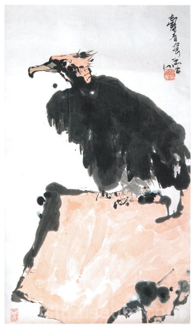 这幅《淡彩画鹫图》是潘天寿先生于1962年创作的一幅指墨画。指墨是潘天寿先生青年时期受家乡的一位老画家影响,采用手指和毛笔结合的作画方式,是潘天寿晚年时十分喜爱的一种艺术表现形式。特制的宣纸上面涂过一层很稀薄的矾水,可以使画面出现特殊的效果,也更易控制干湿。用指甲醮墨,勾勒出如钩般坚硬、锐利的嘴角。用手指沾墨画鹫的头部短毛,稀落而劲健。三角形头部造型被强调,更显出凶悍、迅捷的天性。用展开的手指、手掌裹住墨汁勾画鹫的背部。用食指关节勾勒鹫翅膀上强劲而灵活的关节,使得鹫的翅膀似刚刚收拢,充满了瞬息间的生命动态。画面中秃鹫立于石上,鹫与石各占画面一半,构图简练,气势磅礴。画面中鹫的神气十足,墨色深,石线与色相互衬托,构思别有意境,更是体现了画家雄大、奇险、强悍的审美性格。
