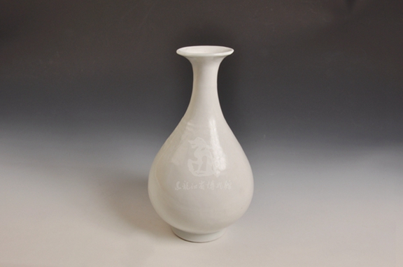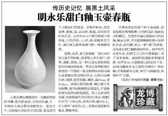 温婉、柔美,是玉壶春瓶一直以来所给人留下的印象,其形制大多为撇口、细颈、垂腹、圈足,是一种以变化柔和的弧线为轮廓线的瓶类。黑龙江省博物馆所收藏的一件国家一级文物明永乐甜白釉玉壶春瓶恰能证明此特点,它瓶口呈喇叭状,细颈、胆形鼓腹、圈足,高33.0cm,宽10.5cm。说到此瓶的造型,则定型于北宋时期,是当时装酒的实用器具,后逐渐演变为观赏性的陈设瓷。至于其名字的来源,有传因唐代司空图在《诗品·典雅》中所写“玉壶买春,赏雨茆屋;座中佳士,左右修竹”而得名,但二者能否直接联系起来,暂难考证。