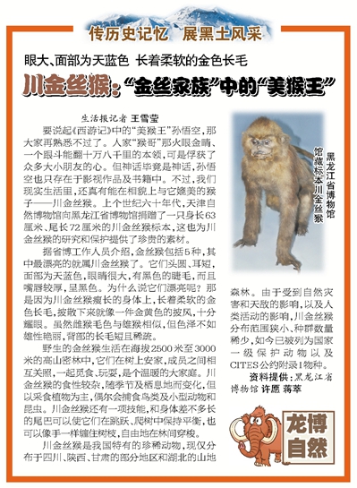 要说起《西游记》中的“美猴王”孙悟空,那大家再熟悉不过了。人家“猴哥”那火眼金睛、一个跟斗能翻十万八千里的本领,可是俘获了众多大小朋友的心。但神话毕竟是神话,孙悟空也只能存在于影视作品及书籍中。不过,我们现实生活里,还真有能在相貌上与它媲美的猴子——川金丝猴。上个世纪六十年代,天津自然博物馆向黑龙江省博物馆捐赠了一只身长63厘米、尾长72厘米的川金丝猴标本,这也为川金丝猴的研究和保护提供了珍贵的素材。