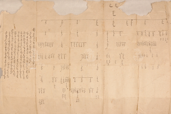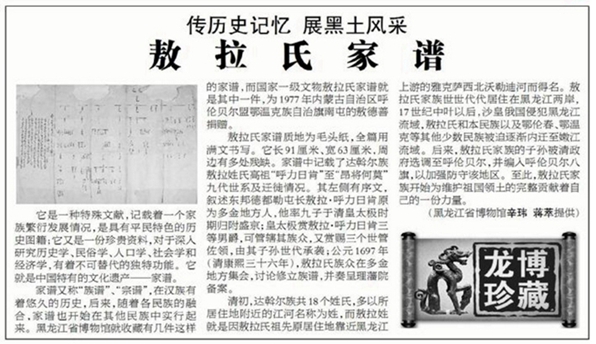 敖拉氏家谱质地为毛头纸,全篇用满文书写。它长91厘米、宽63厘米,周边有多处残缺。家谱中记载了达斡尔族敖拉姓氏高祖“呼力日肯”至“昂将何莫”九代世系及迁徙情况。其左侧有序文,叙述东邦德都勒屯长敖拉·呼力日肯原为多金地方人,他率九子于清皇太极时期归附盛京;皇太极赏敖拉·呼力日肯三等男爵,可管辖其族众,又赏赐三个世管佐领,由其子孙世代承袭;公元1697年(清康熙三十六年),敖拉氏族众在多金地方集会,讨论修立族谱,并奏呈理藩院备案。