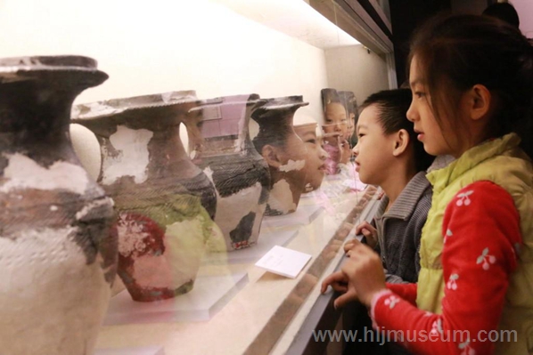 首先,孩子们在讲解员的带领下来到黑龙江历史文物陈列展厅,看到了距今1000多年前同仁文化遗址出土的盘口鼓腹罐、南北朝—隋唐时期的重唇长颈鼓腹罐、黑陶罐、陶罐、重唇长颈小底罐等典型陶罐。在听过讲解员的讲解后,他们知道了这些陶罐的学术价值以及不同时期陶罐纹饰的特点,从而对这些年代久远的器物产生了浓厚的兴趣。