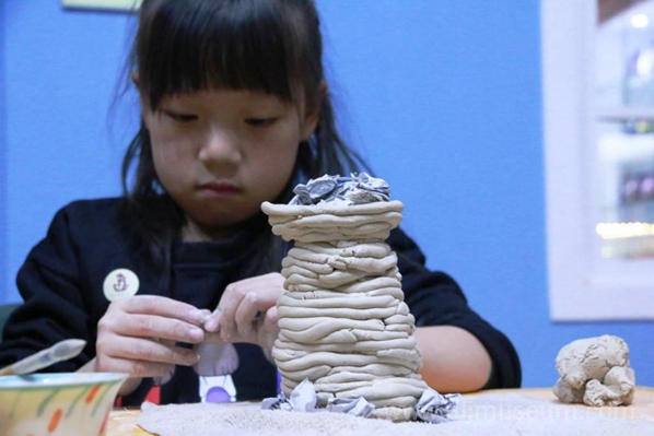 然后,孩子们回到课堂上,老师先展示模型,并讲解其制作原理,随后让每个小朋友在家长的协助下进行制作。先把黏土压制成一个均匀的圆泥饼,作为器物的底部。接下来把黏土搓成细条,沿着泥饼的边缘一层一层向上垒筑,一直垒到所需要的高度。然后检查其缝隙,用黏土涂抹缝隙,将其封堵。基本型状完成后可用工具刻划、压制出表面花纹并完善器物肌理。这样,一件古朴风格的陶器泥坯就制作完成了。之后的几天里,它还需要干燥后再经过1300度高温的烧制才能成为可使用的陶器。