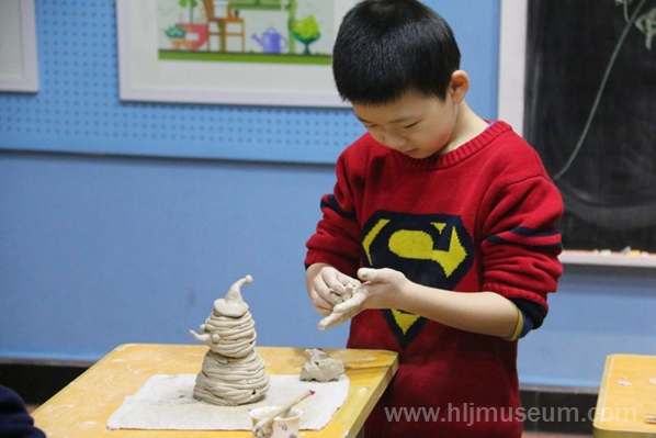 课堂上,老师让小朋友在家长的协助下进行制作。先把黏土压制成一个均匀的圆形泥饼,作为雪人的底部;接下来,把黏土搓成细条,沿着泥饼的边缘一层一层向上垒筑,一直垒到所需要的高度;然后,检查其缝隙,用黏土涂抹缝隙,将其封堵。基本形状完成后,粘上雪人的手臂、鼻子、眼睛、帽子、围巾等装饰品,待它干燥后经过1300度高温的烧制,陶瓷雪人就制作完成了。