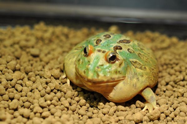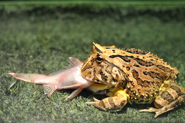 角蛙也有个绰号叫“垃圾桶”,可见它是个来者不拒的家伙,如小鱼、蟋蟀、面包虫、摇晃的肉片或是死老鼠,甚至是比他体型小的蛙类都可以是它的食物。