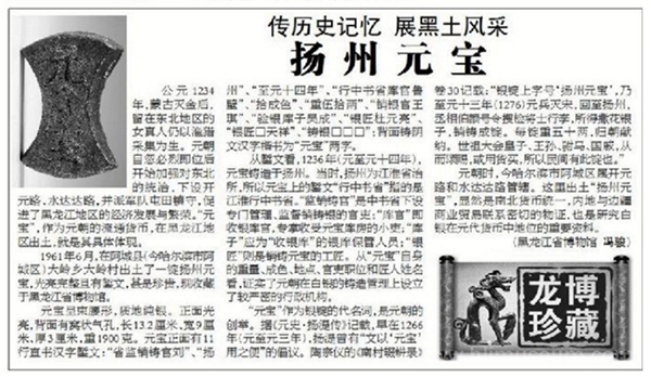 元朝时,今哈尔滨市阿城区属开元路和水达达路管辖。这里出土“扬州元宝”,显然是南北货币统一,内地与边疆商业贸易联系密切的物证,也是研究白银在元代货币中地位的重要资料。