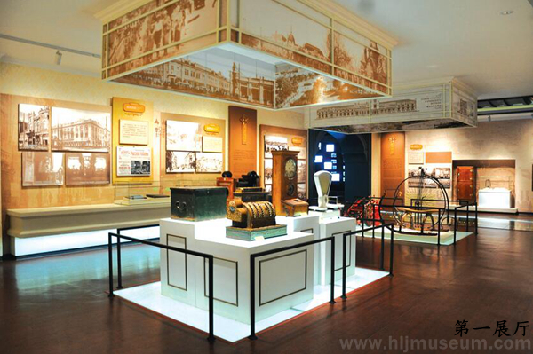 第一展厅,为“哈埠初成”与“商场峥嵘”两部分内容。“哈埠初成”单元介绍了铁路兴建背景,并利用触摸屏展示完整存世仅三本的《中东铁路大画册》,后半段展线展示城市基础设施建设,中心设置实物台陈列大型文物。第一展厅后半部分为“商场峥嵘”单元内容,展示了部分纸质文物,中心展区则集中陈列大型商业文物。