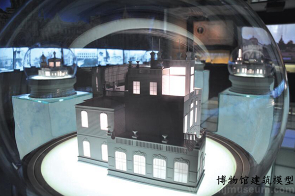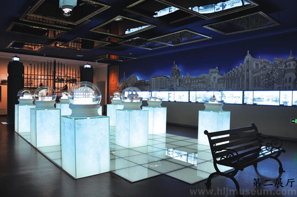 在“凝固华彩”单元的设计中将俄式冰雪水晶球与哈尔滨老建筑模型相融合,并以冰雕立柱造型为底座,与展厅墙面的冰雪元素、哈尔滨老建筑剪影、老建筑照片和展厅上方的镜面相呼应,在方寸之间凸显冰雪世界中的欧式建筑之美。
