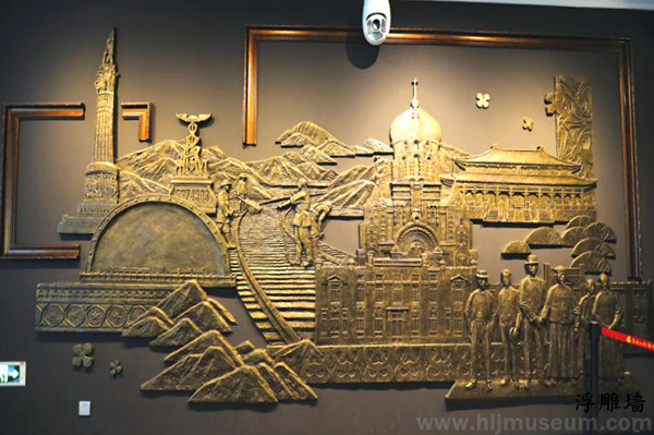 因此,在总体形式设计上,贯彻“一以贯之”的展陈理念:序厅浮雕墙设计是以抽象方式将铁路穿插于哈尔滨的标志性老建筑中,并塑造中俄设计施工者形象,使观者一目了然铁路带来的中西方文化的交融。
